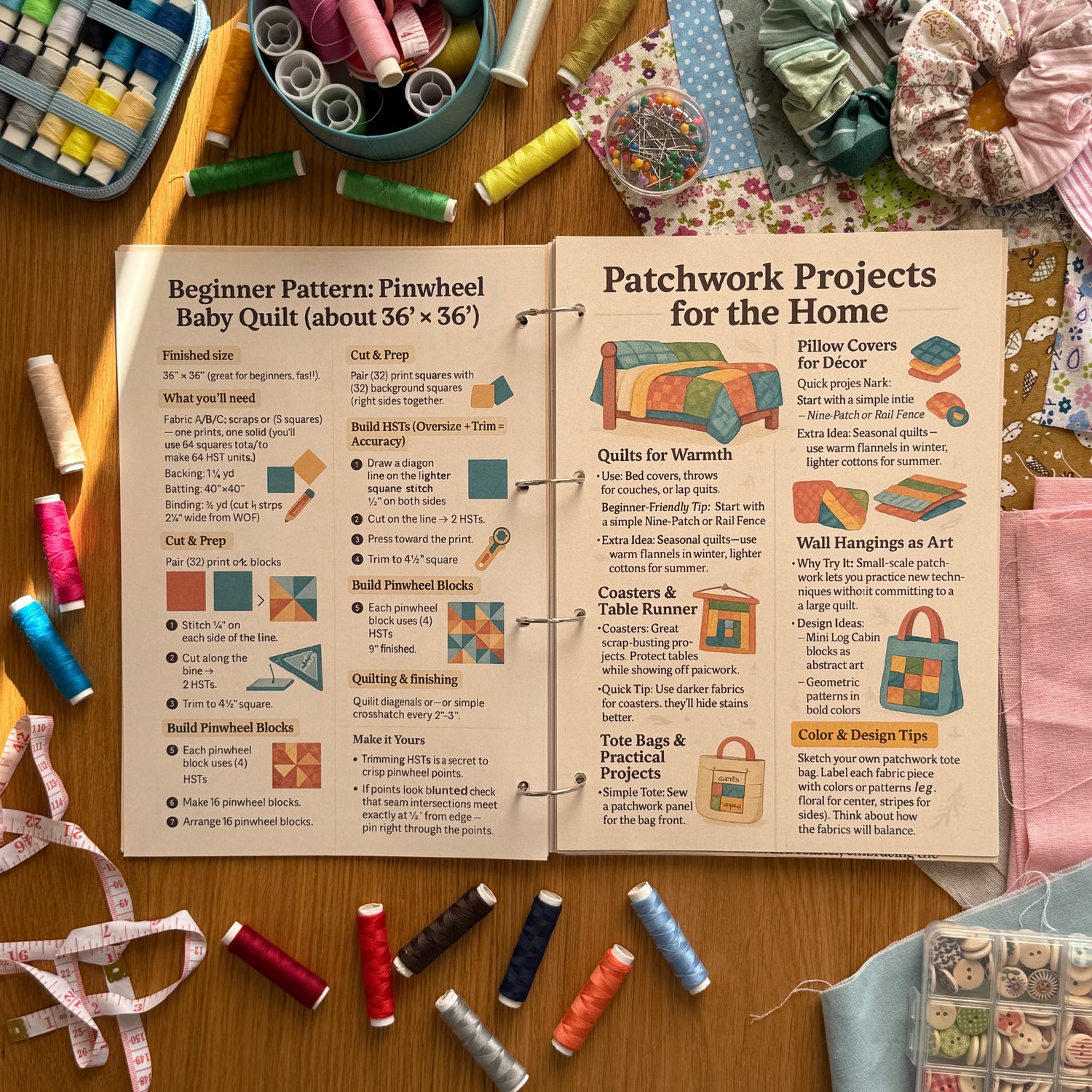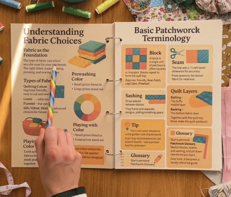 This Patchwork Guide helps you plan each project with intention — so every stitch, color, and fabric choice comes together beautifully. Keep track of what works best and watch your creativity grow with every piece you make.